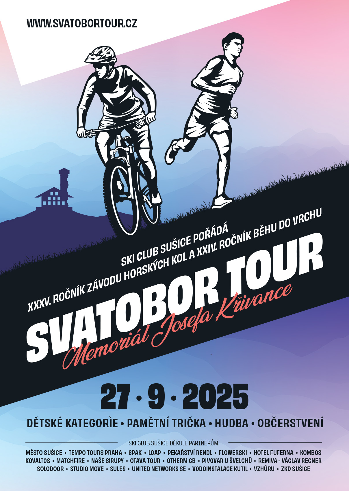 Pojďte s námi opět zdolat dominantu Sušice – Svatobor, legendární vrchol, který nám všem přirostl k srdci. Letos náš čeká jubilejní 35. ročník závodu horských kol a 24. ročník běhu.